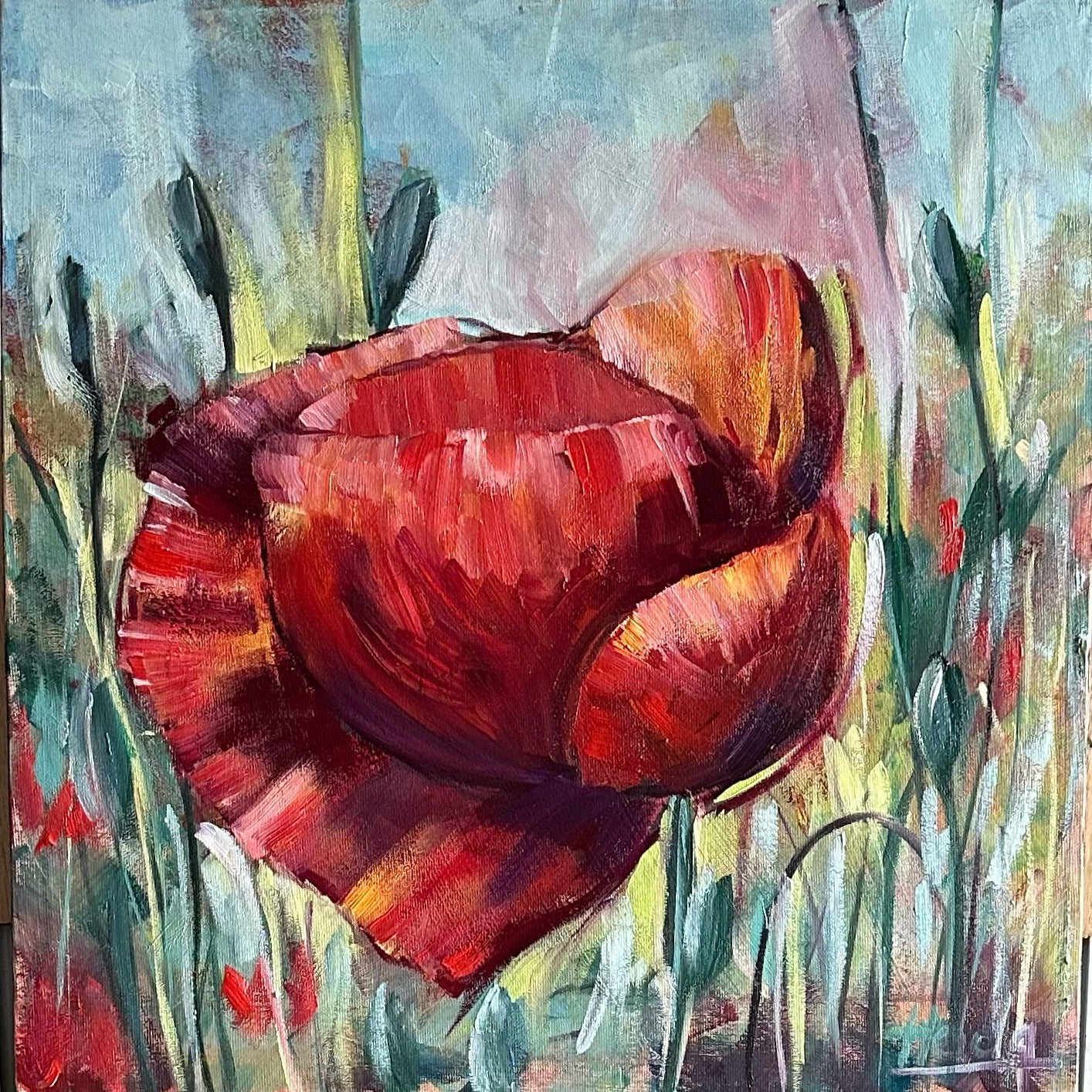 When colorful flowers start to show up in our yards, we know that Spring and summer are here to stay. This painting can be paired with another same size painting or be hung on its own. The bright reds an oranges can brighten any space in your home or cottage.