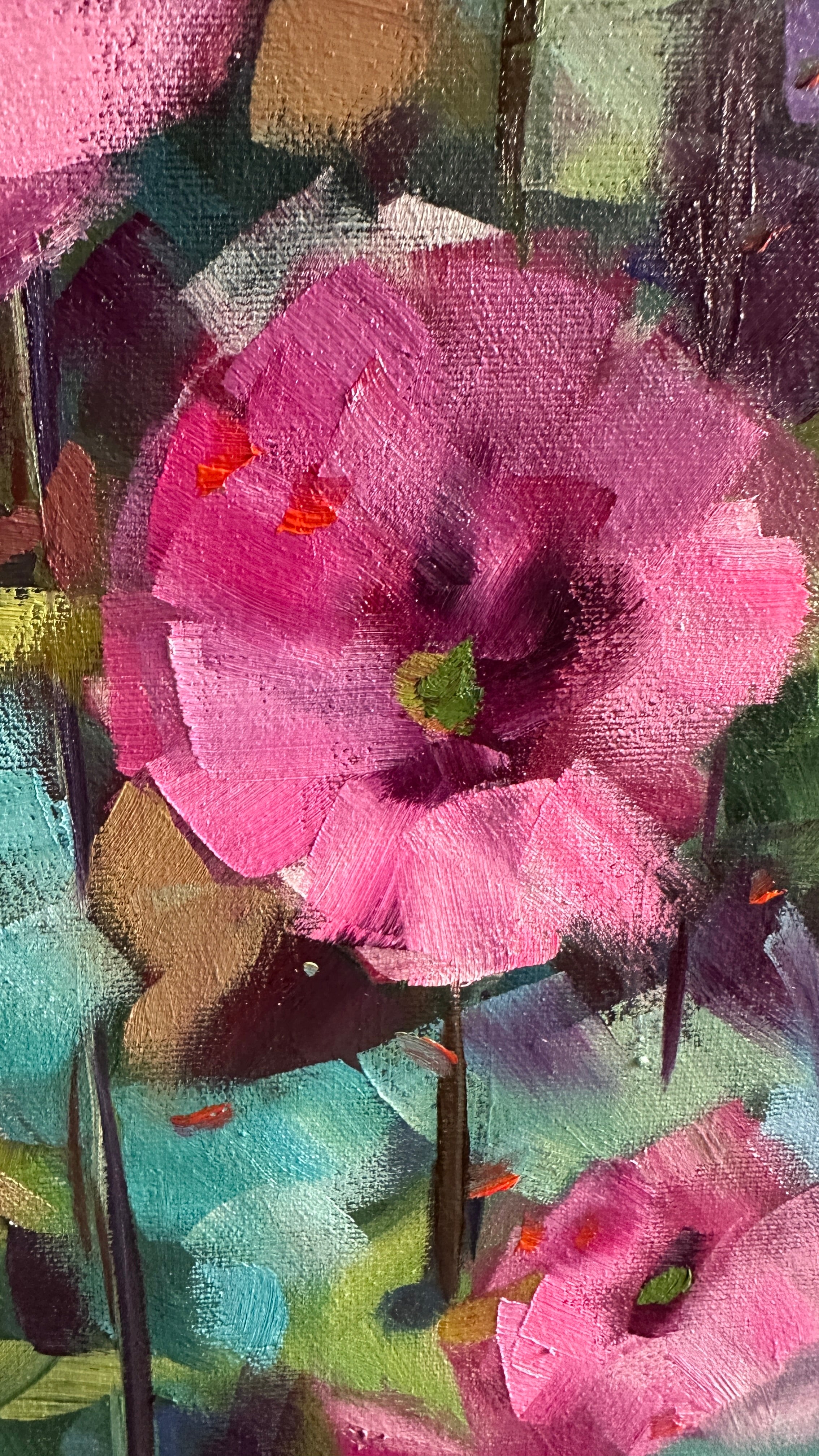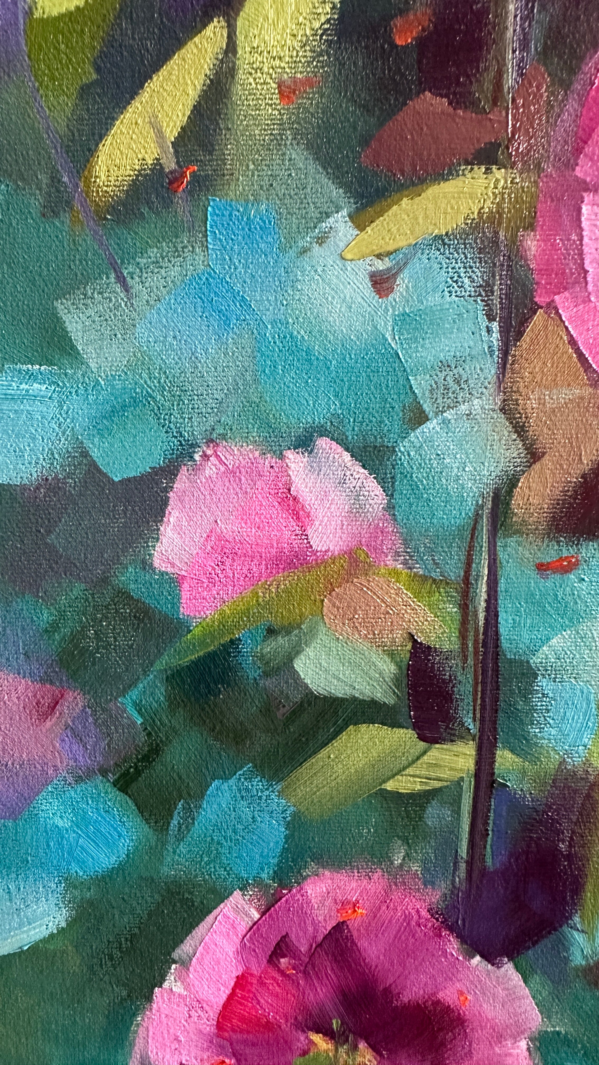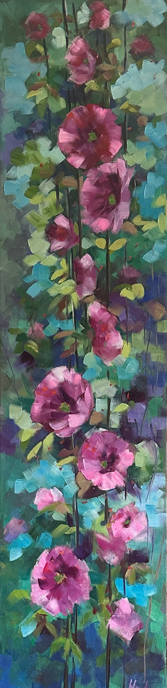 The Sound of Peace — Tall stems of pink blooms rise gently against a harmony of greens and purples, evoking the quiet beauty and calm of a summer garden.