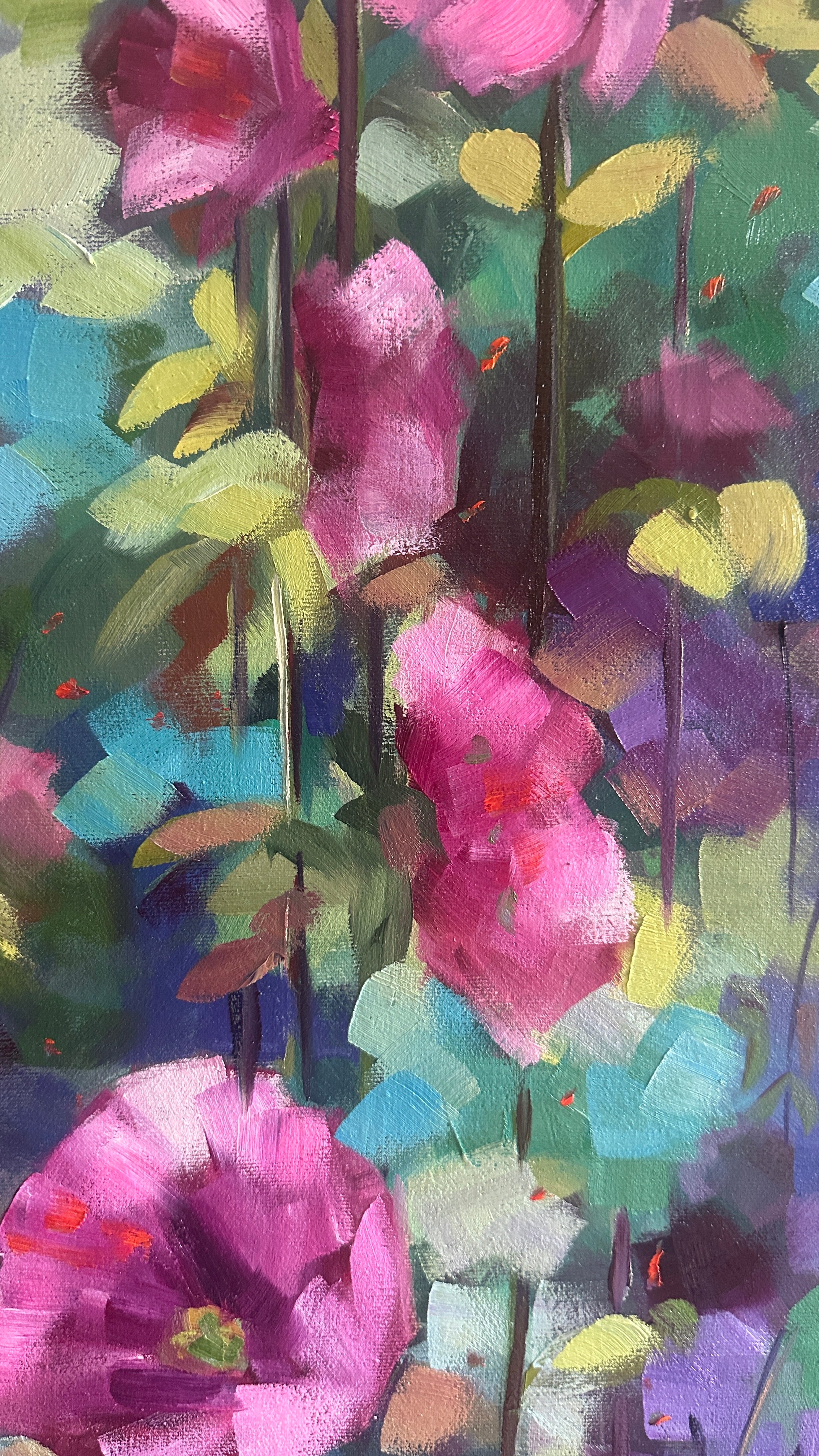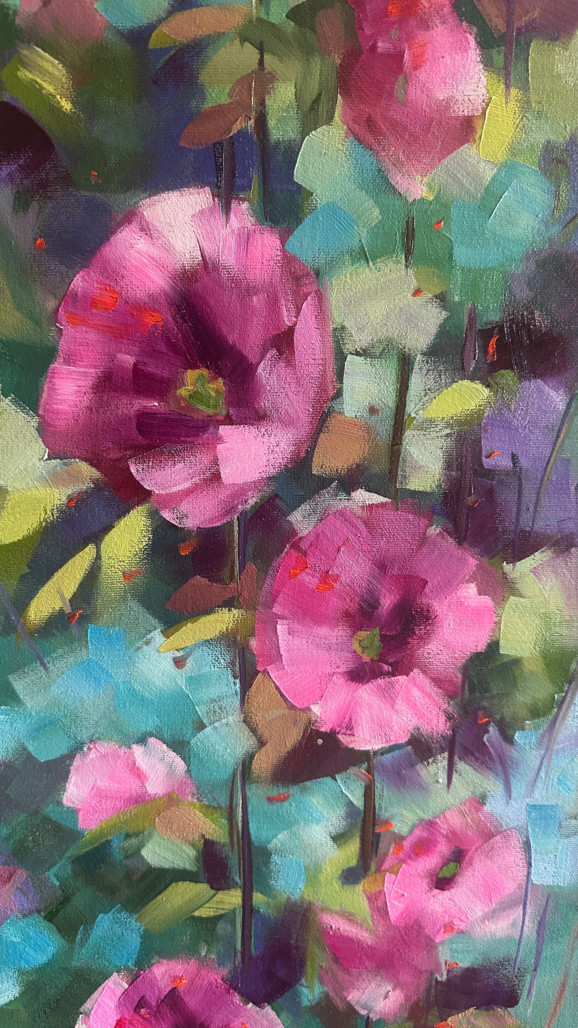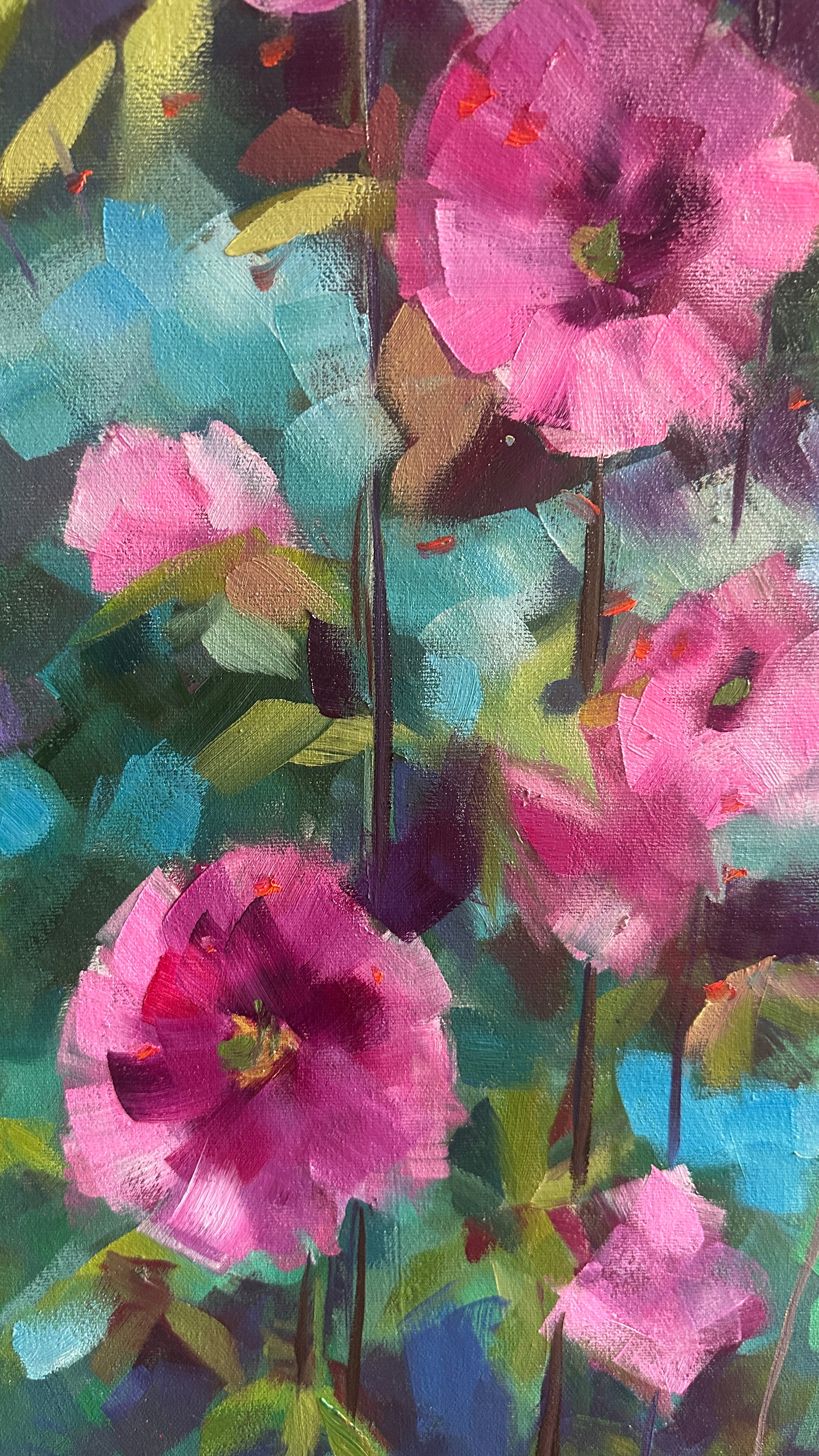 The Sound of Peace — Tall stems of pink blooms rise gently against a harmony of greens and purples, evoking the quiet beauty and calm of a summer garden.