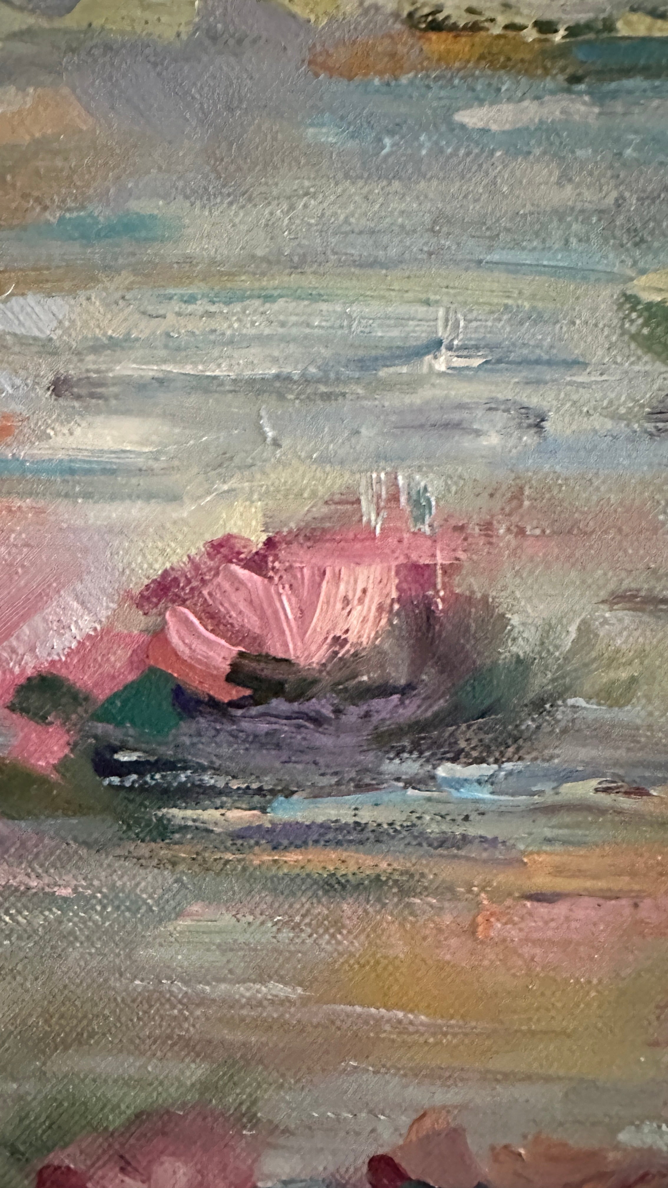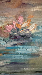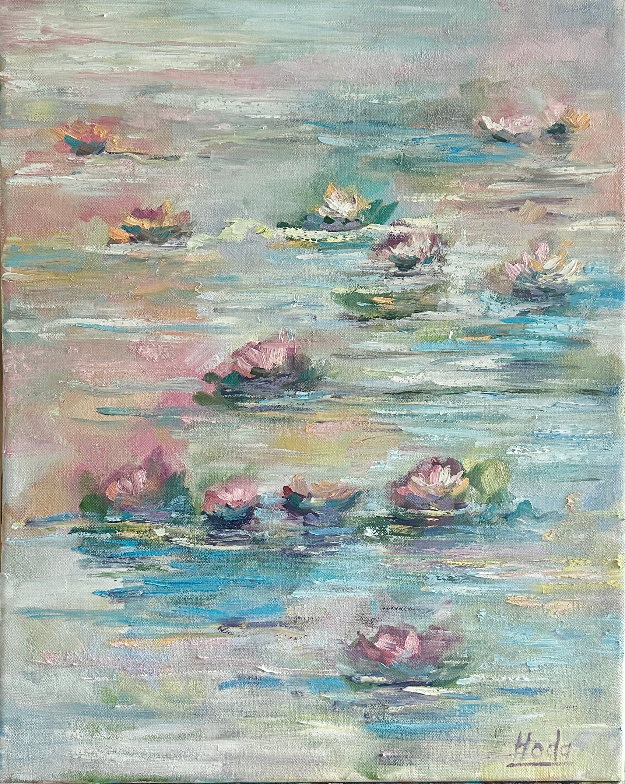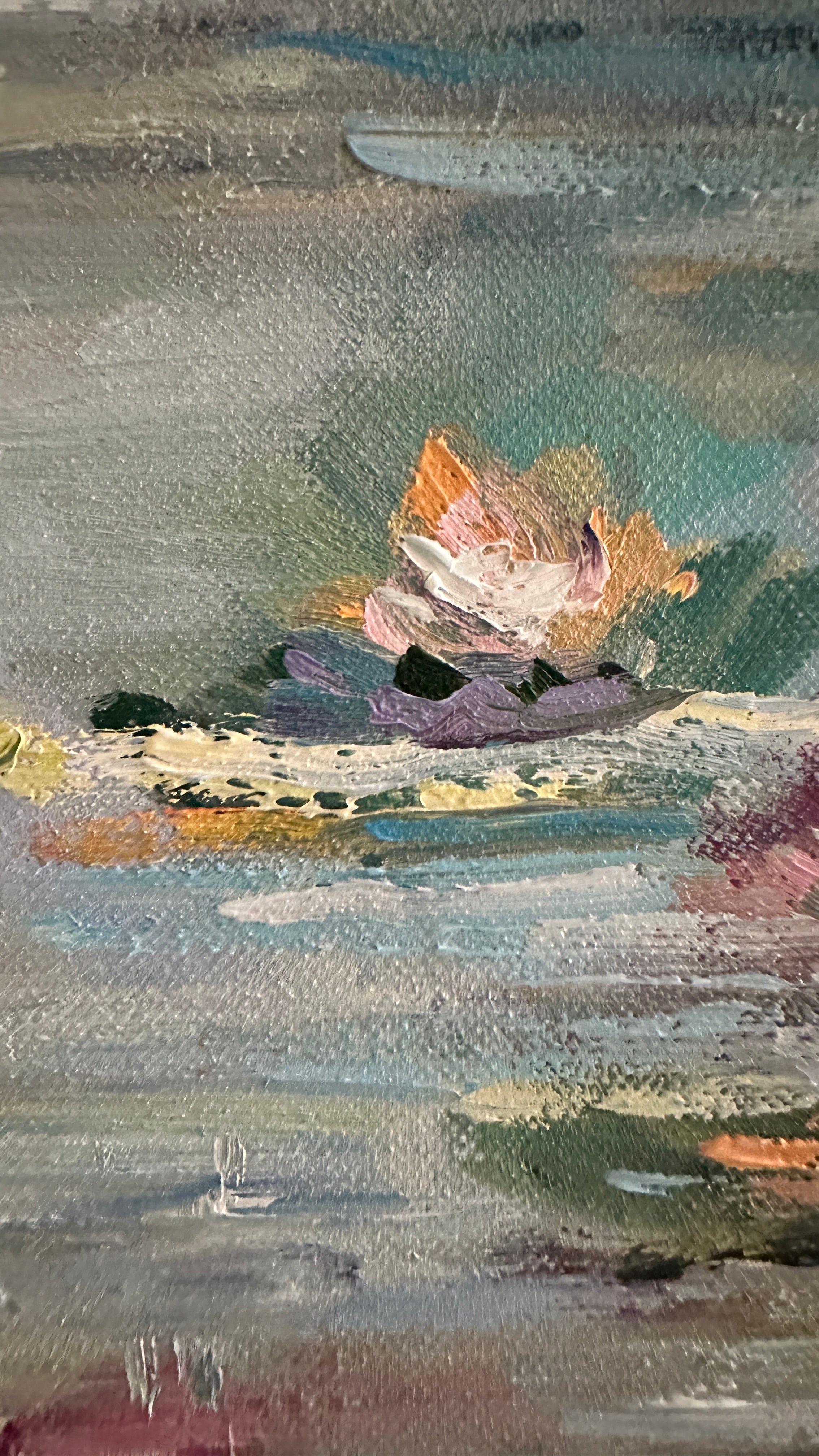A contemporary impression of water lilies drifting across a calm surface. Painted in soft, layered strokes, the piece captures the delicate tension between stillness and movement. Hints of pink, violet, and turquoise shimmer across the water, reflecting a dreamlike palette that shifts with the light.