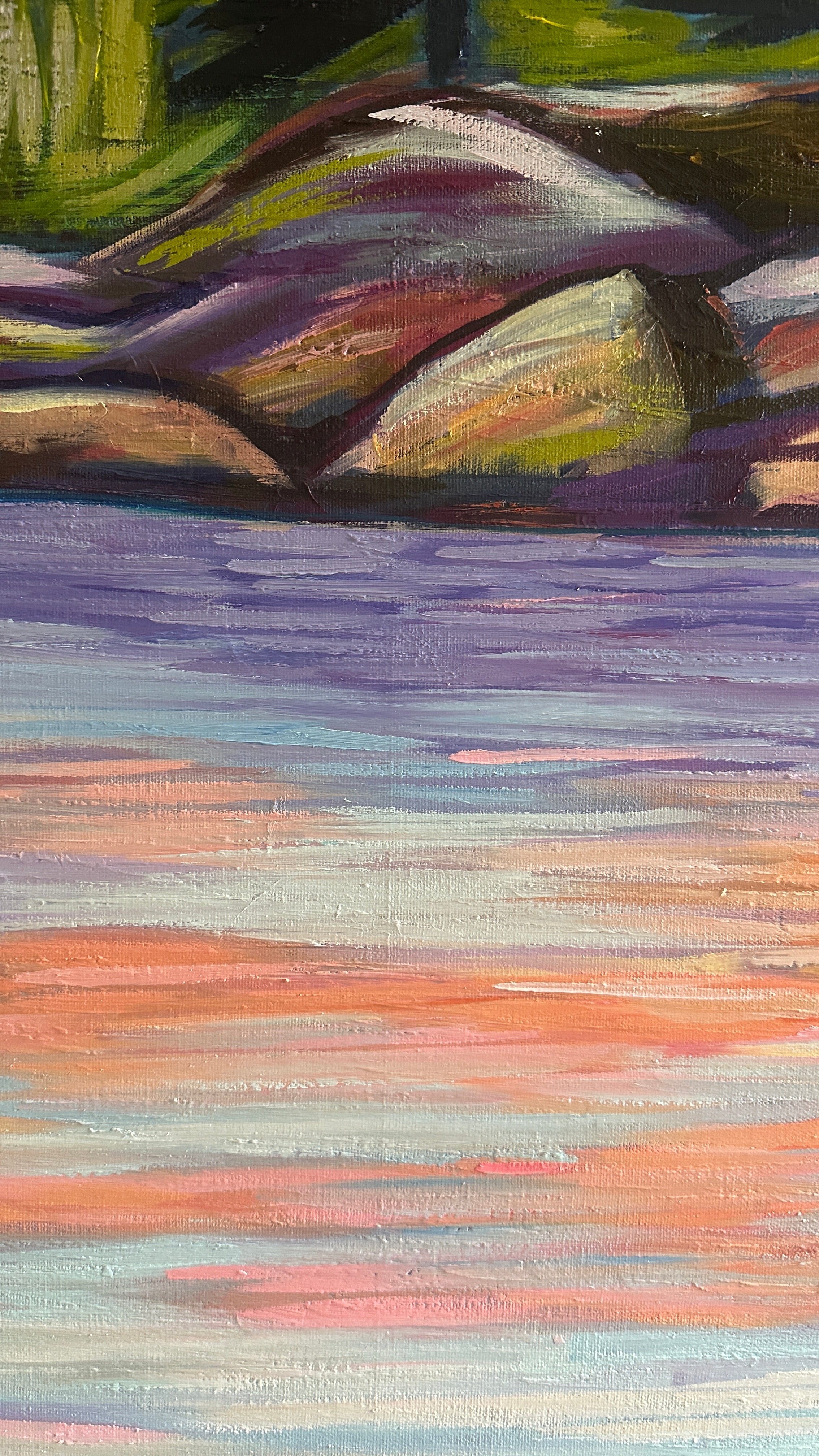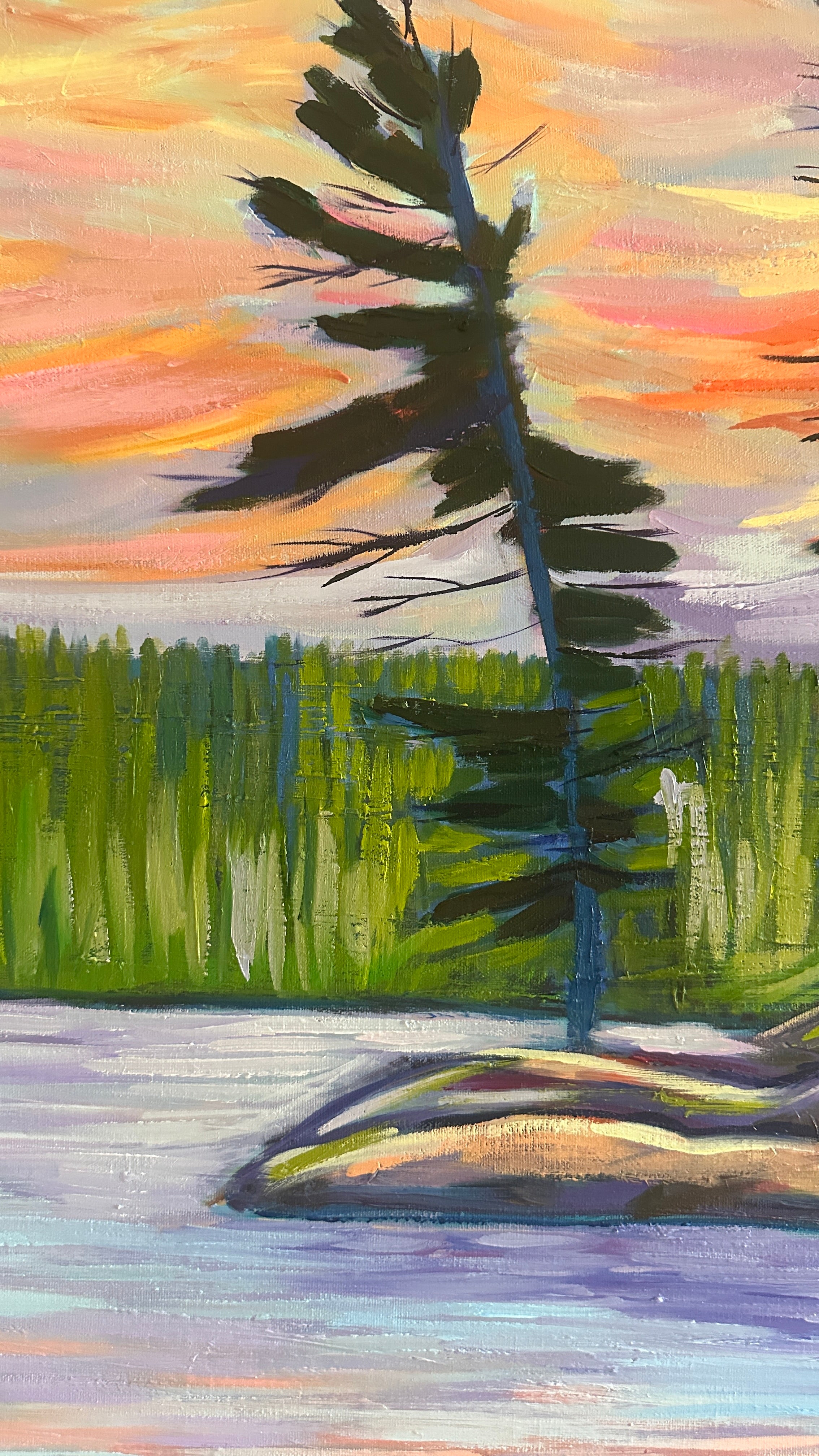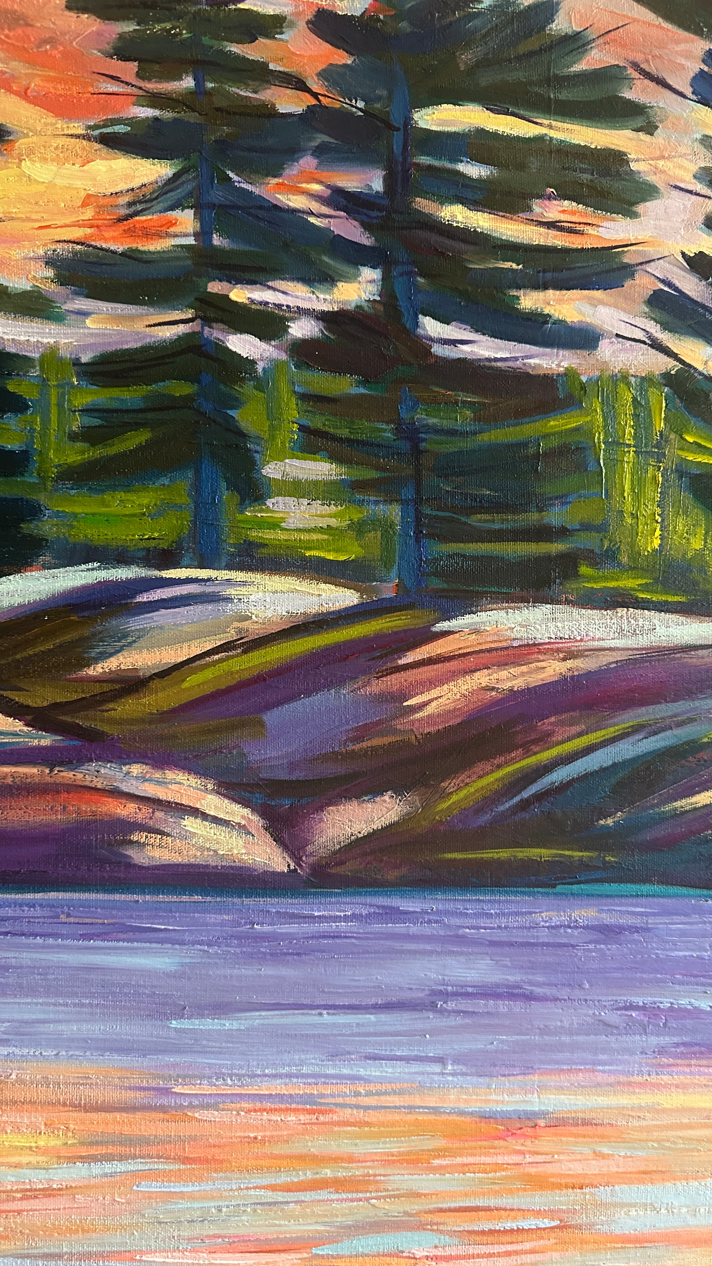 This 36” x 60” oil on canvas captures the peaceful beauty of nature as day meets night. With sweeping strokes of violet, lavender, and rose, the sky and water dance together in perfect harmony. Pine trees and rugged rocks anchor the scene, standing tall against the glowing horizon. The reflection of the sunset across the lake creates a sense of movement and melody, as if the landscape itself is playing a gentle symphony in color. A calming and vibrant piece, it brings the serenity of a lakeside sunset into any space at your home or your cottage.