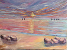 As the sun sinks gently beneath the horizon, colors dance across the sky in perfect harmony. “Evening Melodies” captures that fleeting moment when light and water unite in song — a symphony of purples, golds, and soft rose tones reflecting the quiet poetry of dusk. The gentle rhythm of the waves and the stillness of the stones invite the viewer to pause, listen, and feel the serene music of nature’s end-of-day glow