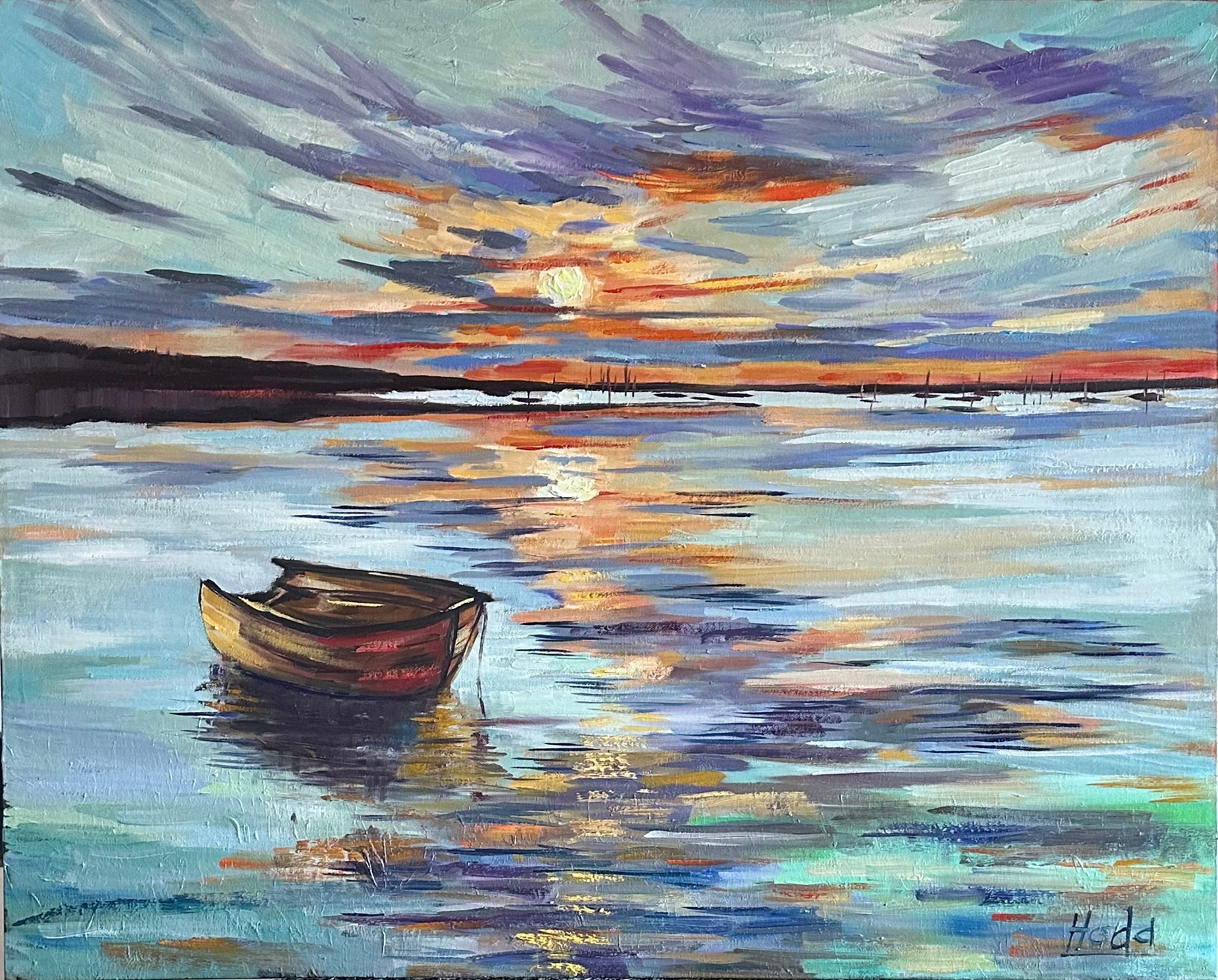 This beautiful, breathtaking sunset is painted in oil on a gallery-wrapped canvas, ready to bring joy to any space in your home or cottage. A golden boat rests upon tranquil waters, its reflection mingling with sunset hues. I used a fresh palette where blues carry a hint of green, lending the scene a soft, muted glow—like the quiet magic of a summer evening.