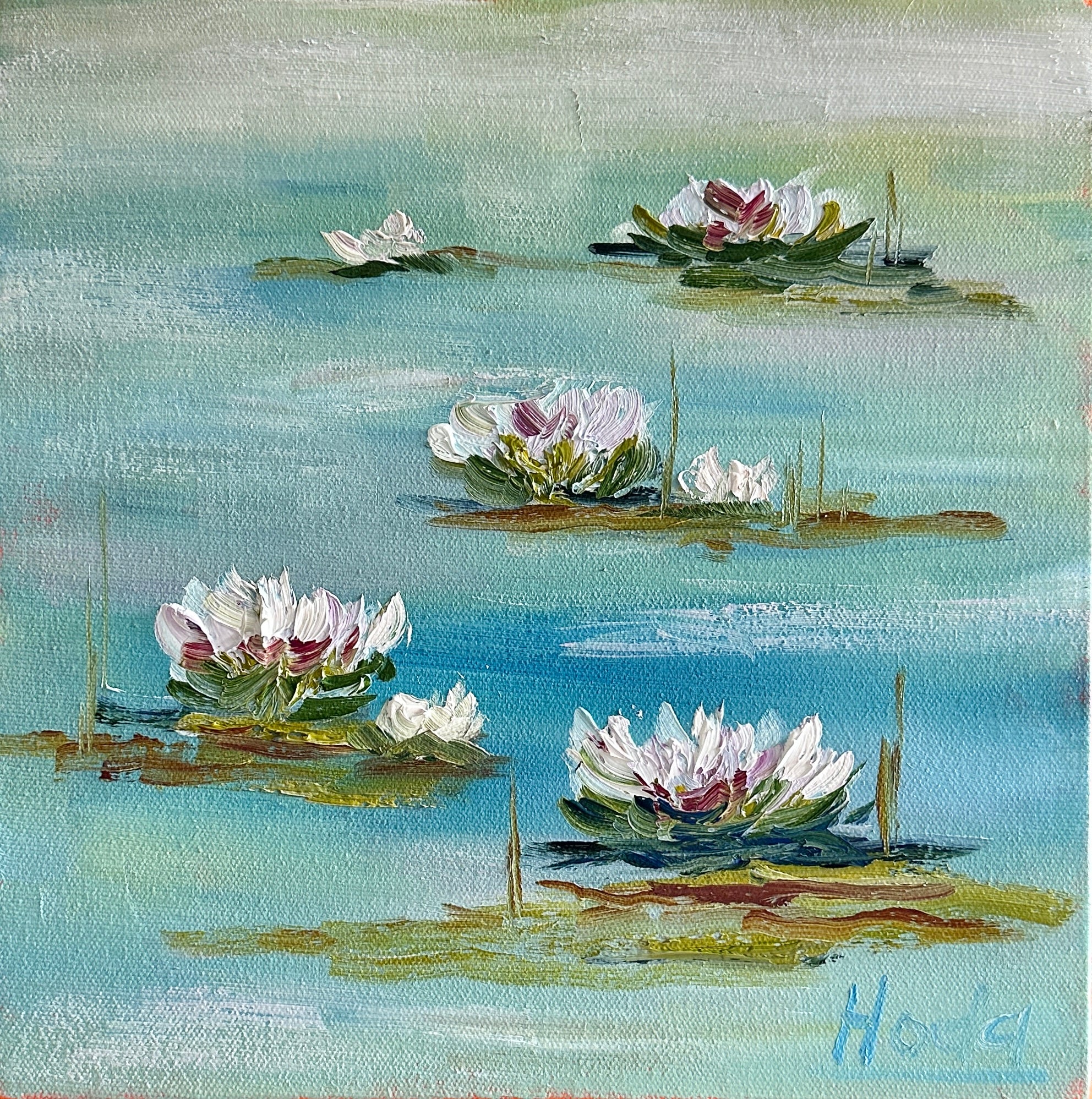 A gentle study of water lilies drifting in soft blue light, Hopeful Heart evokes serenity and emotional warmth. Layered petals and tranquil reflections suggest connection, tenderness, and the quiet beauty of being held in stillness.