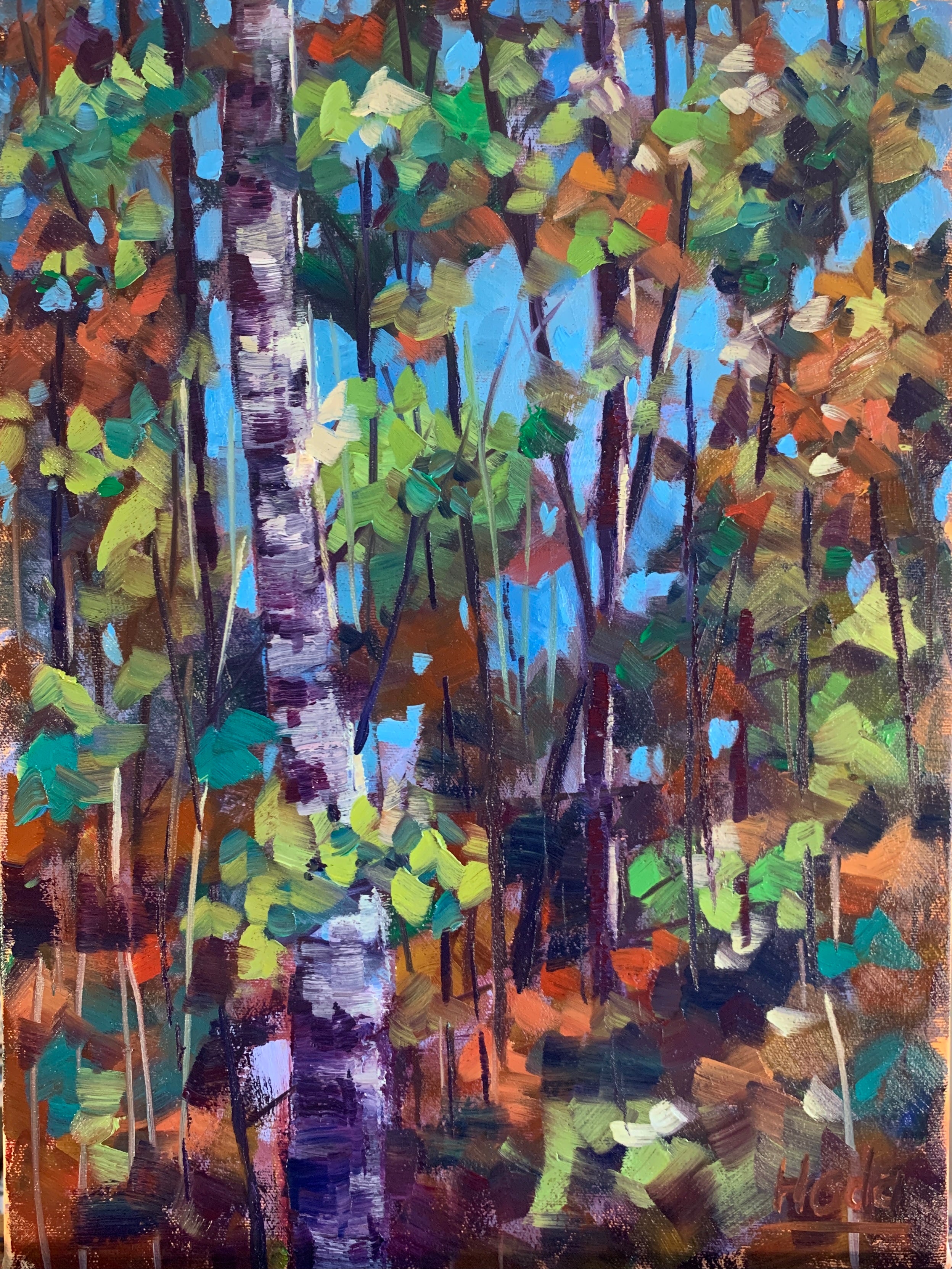 This landscape oil painting is inspired by the beautiful Canadian landscape. Birch Trees can be magical in the midst of the woods with their lighter color bark amidst all the other trees. Painting this small painting has been much fun!