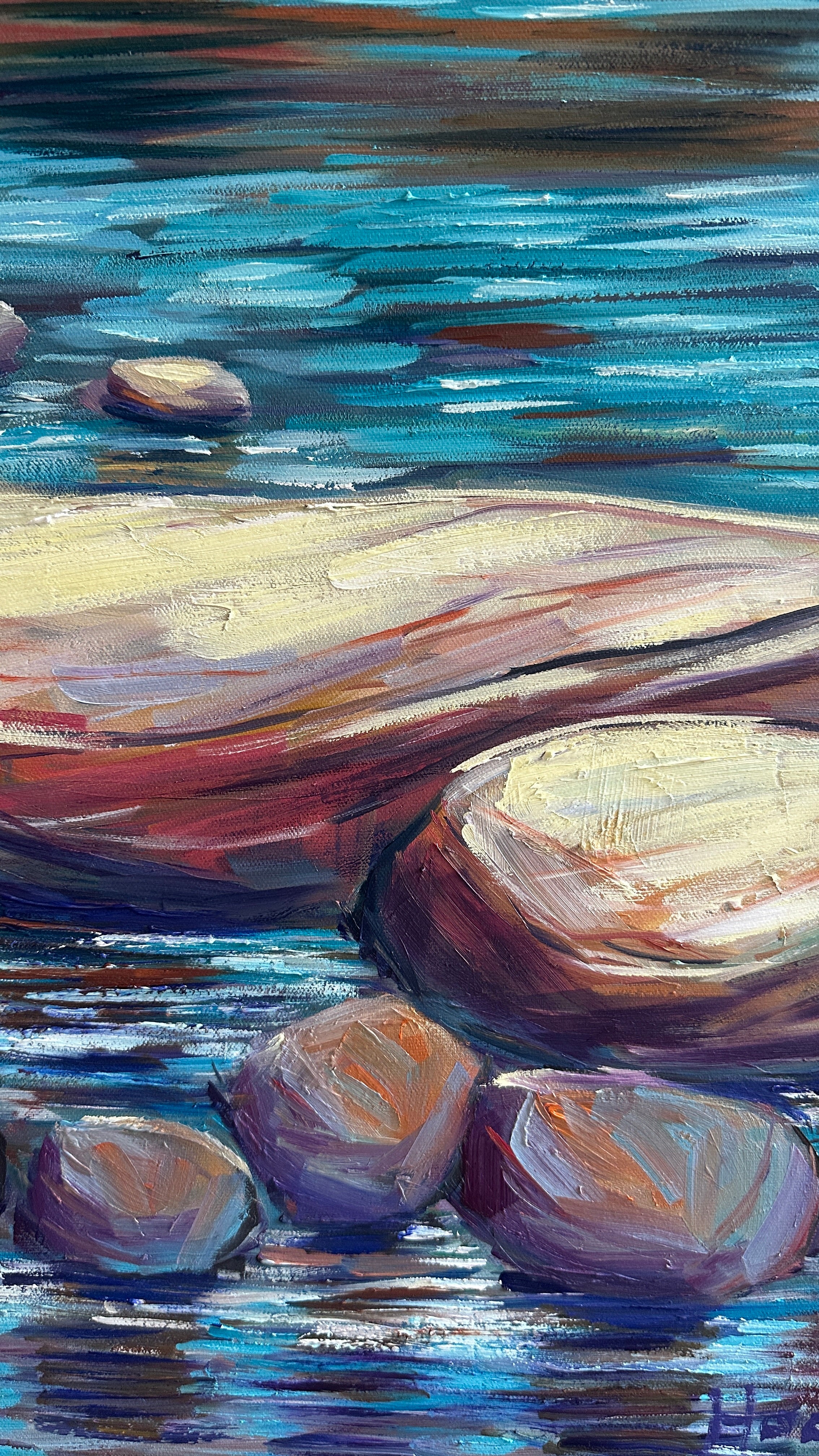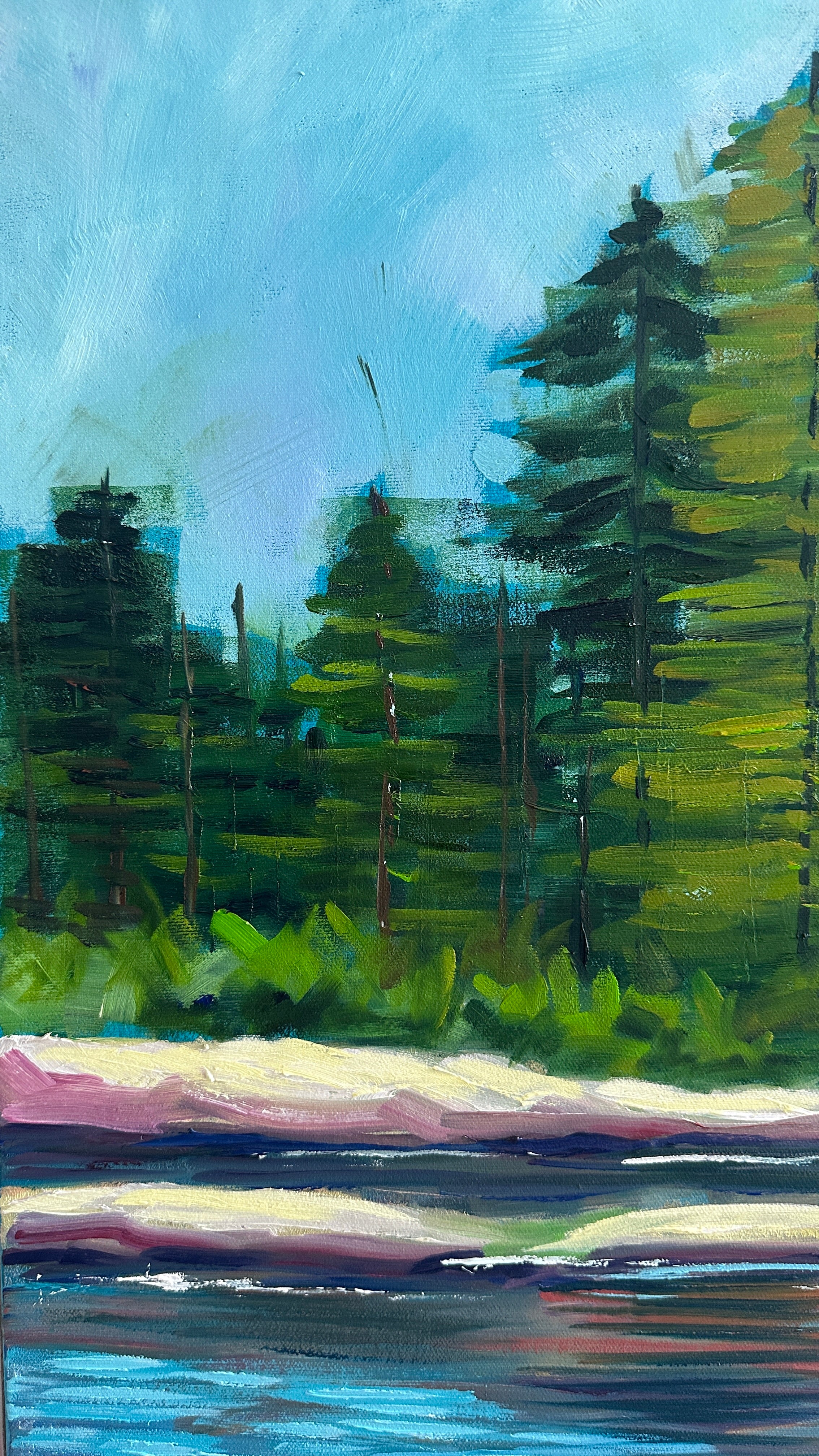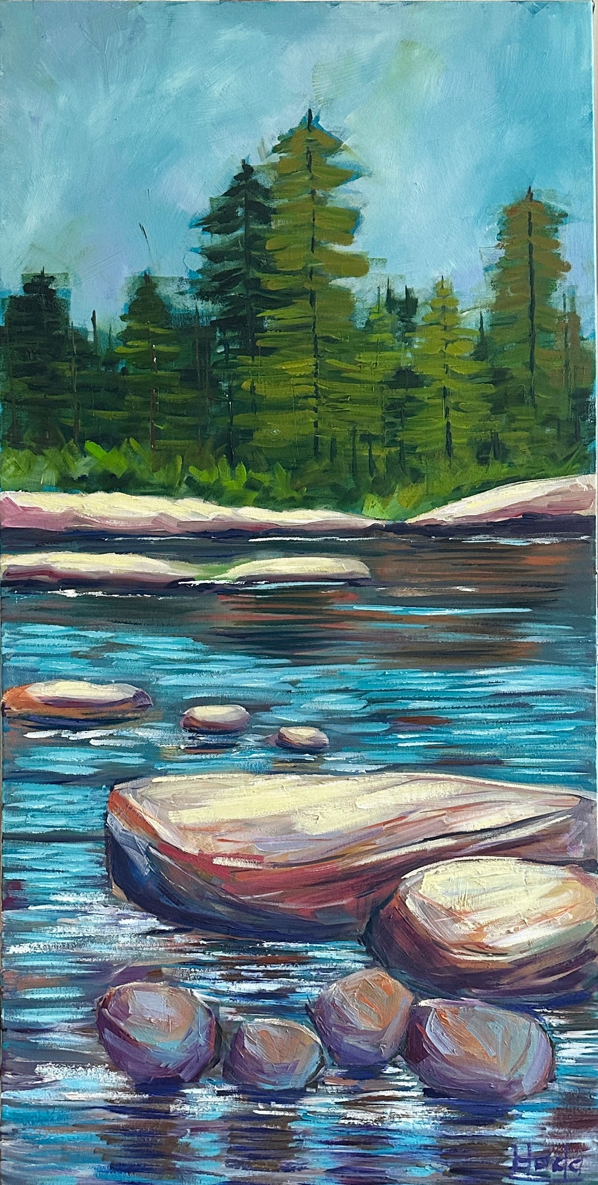 A quiet stream winds its way through smooth stones and gentle reflections, inviting the viewer to pause and breathe. The soft blues and earthy tones create a sense of calm, while the towering pines stand like guardians of peace. This painting is a meditation on stillness—a sacred place where grace flows freely and the soul finds rest. Inspired by the beauty of creation and the quiet whisper of God’s presence in nature.