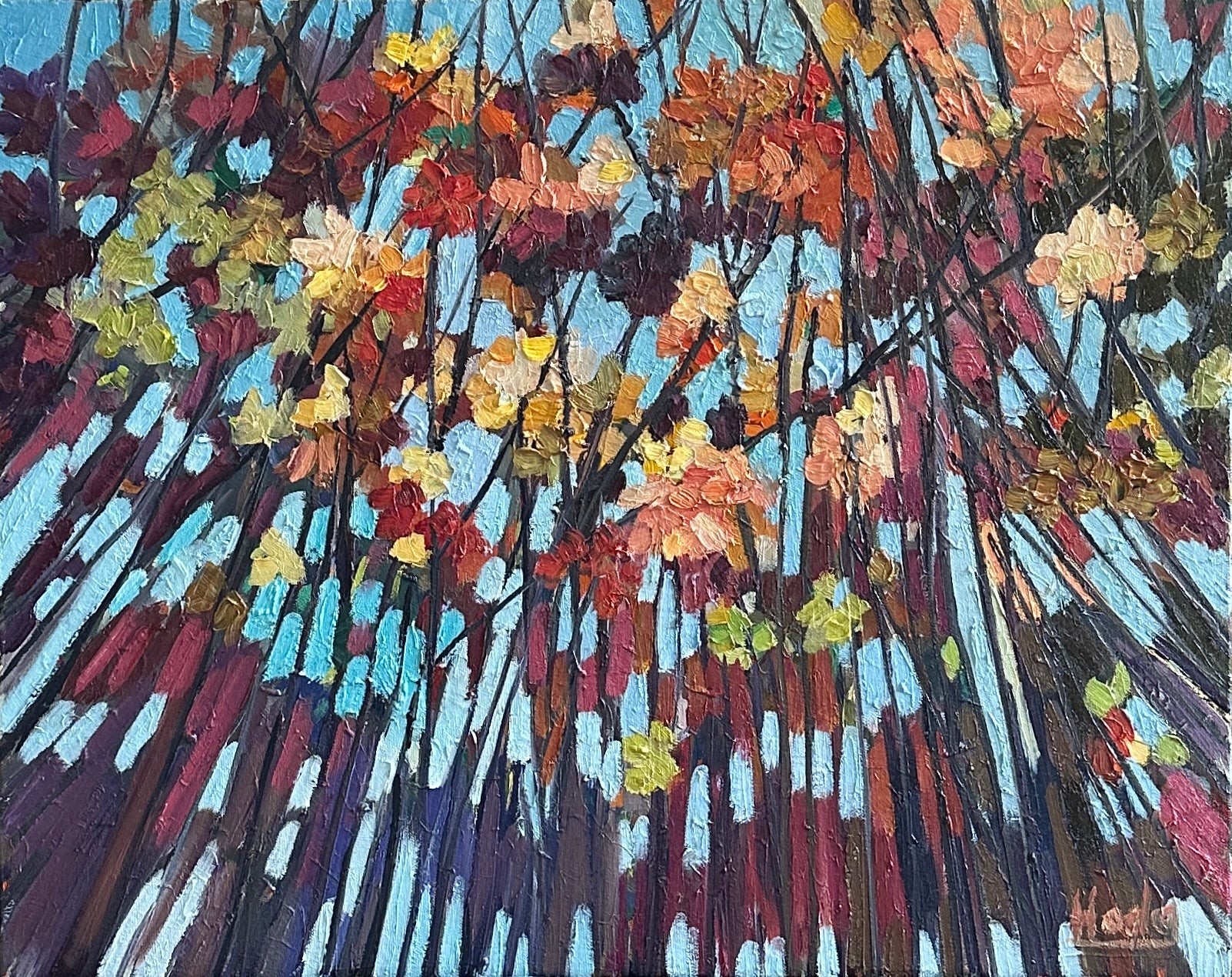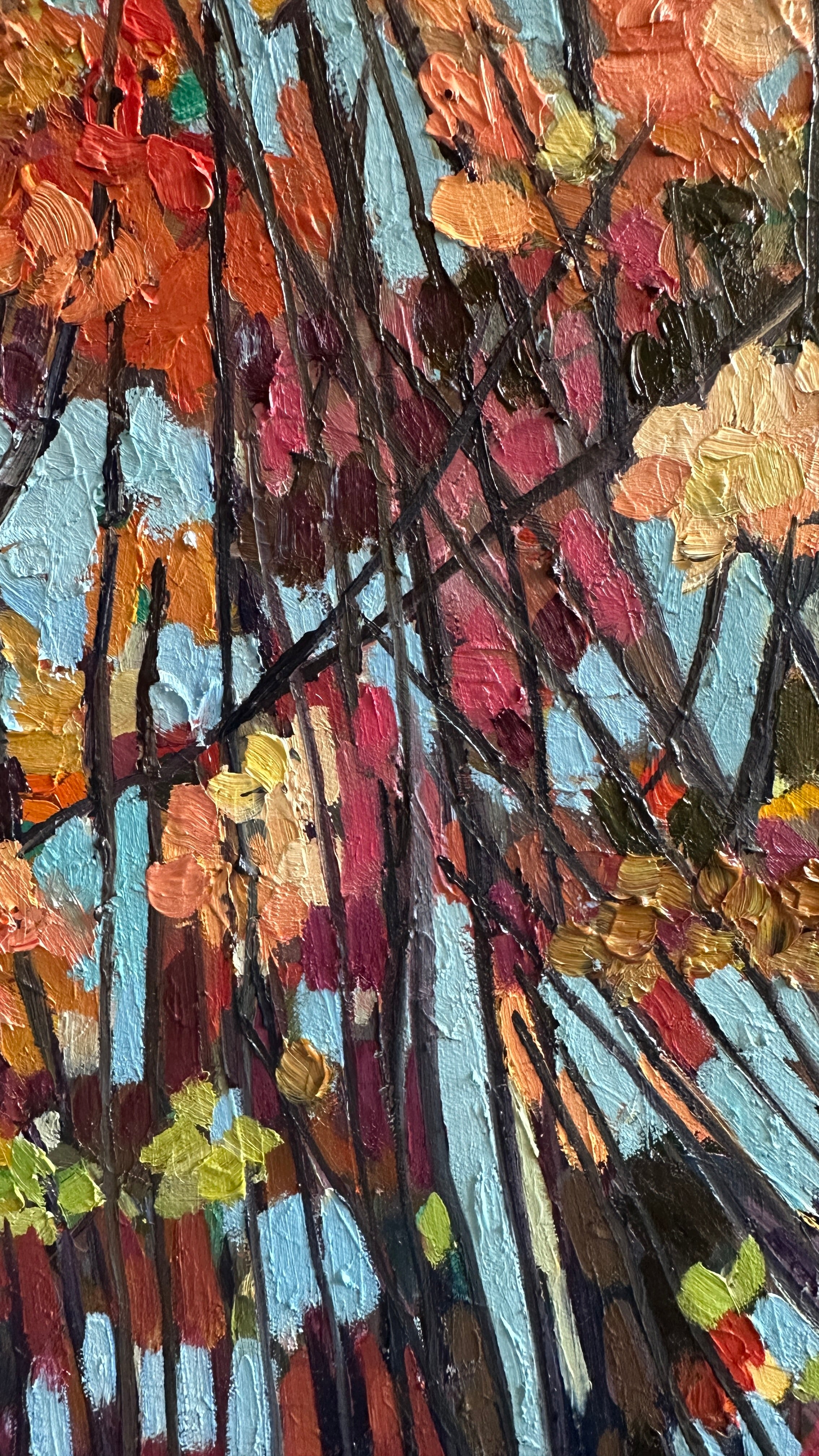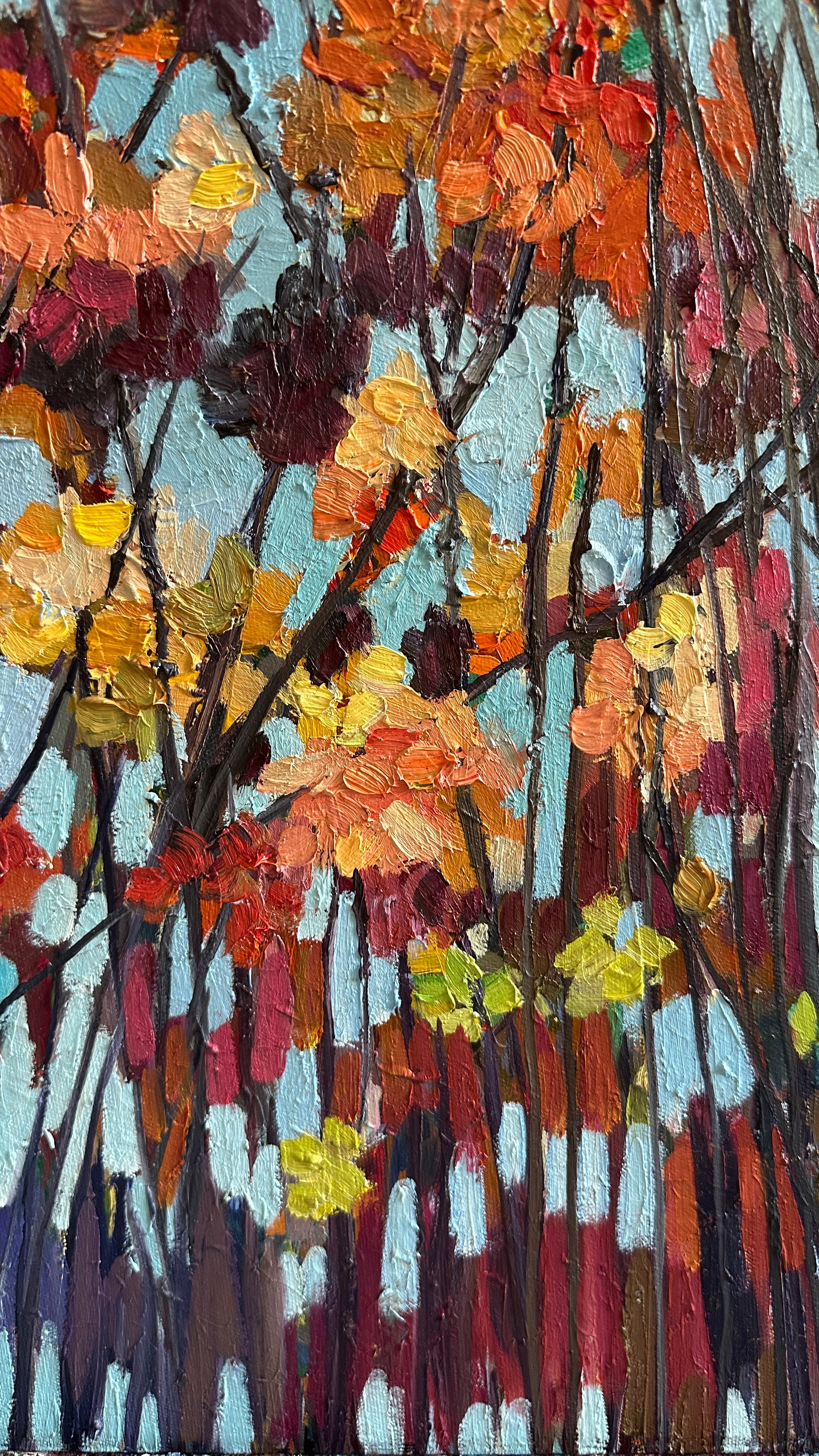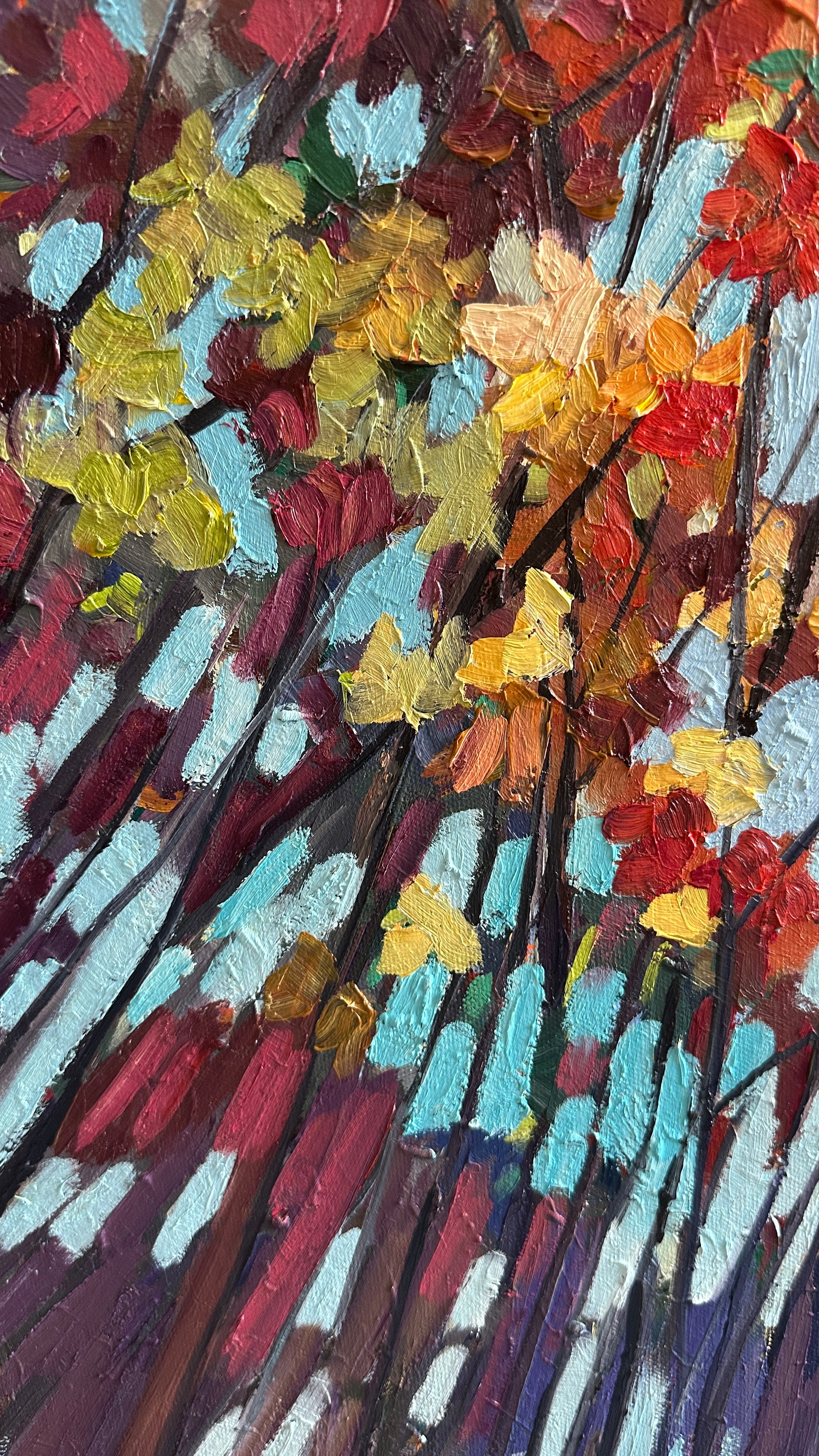 The colors and perspective makes this painting suitable for home or cottage bringing a splash of color to the walls. The colors are not loud yet they are vivid and vibrant
