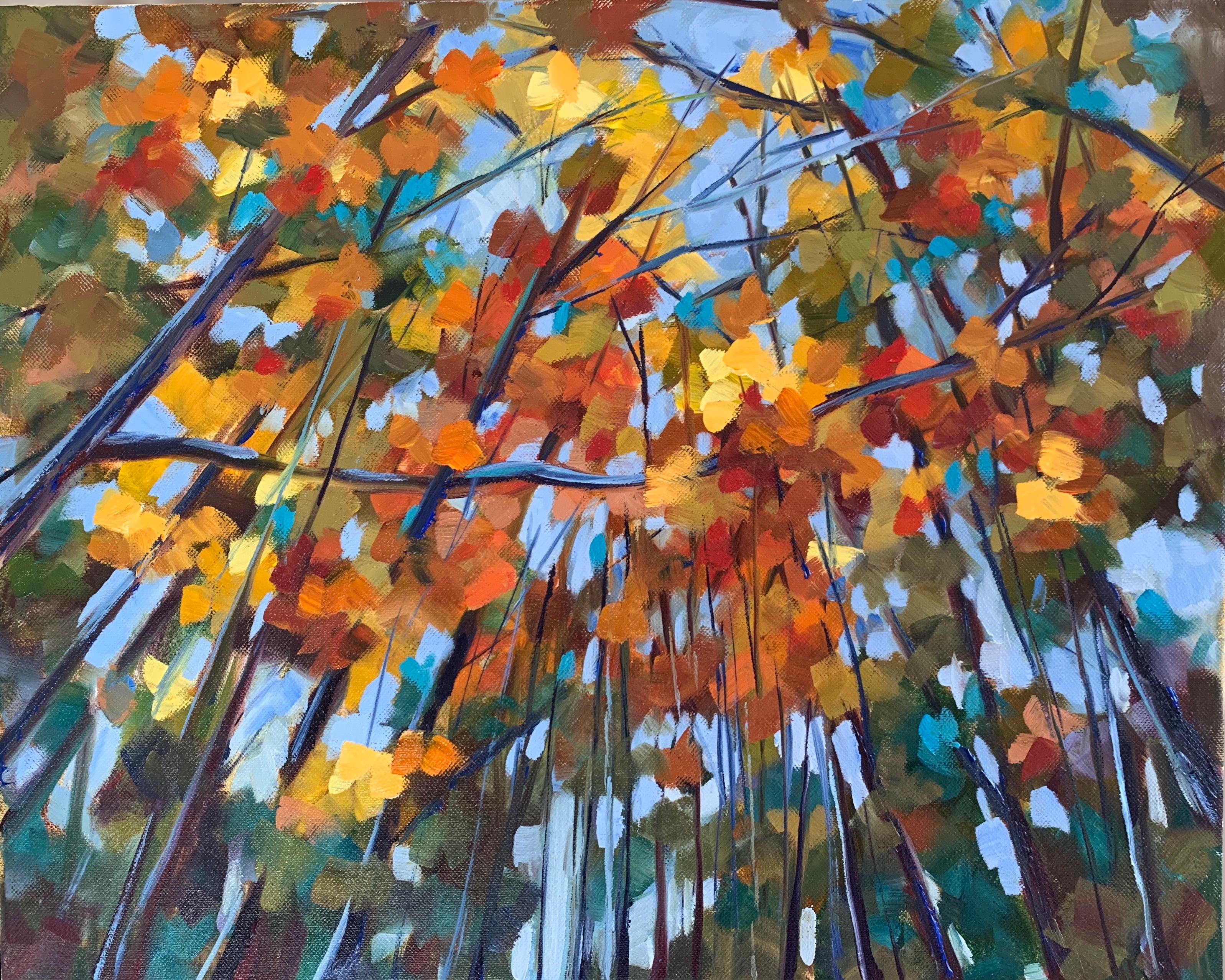 I love painting the fall with its bright, joyful yellows, reds and oranges! And one of my favorite views is that “looking up” perspective where the sky meets the top of the trees and creates beautiful abstract shapes!
