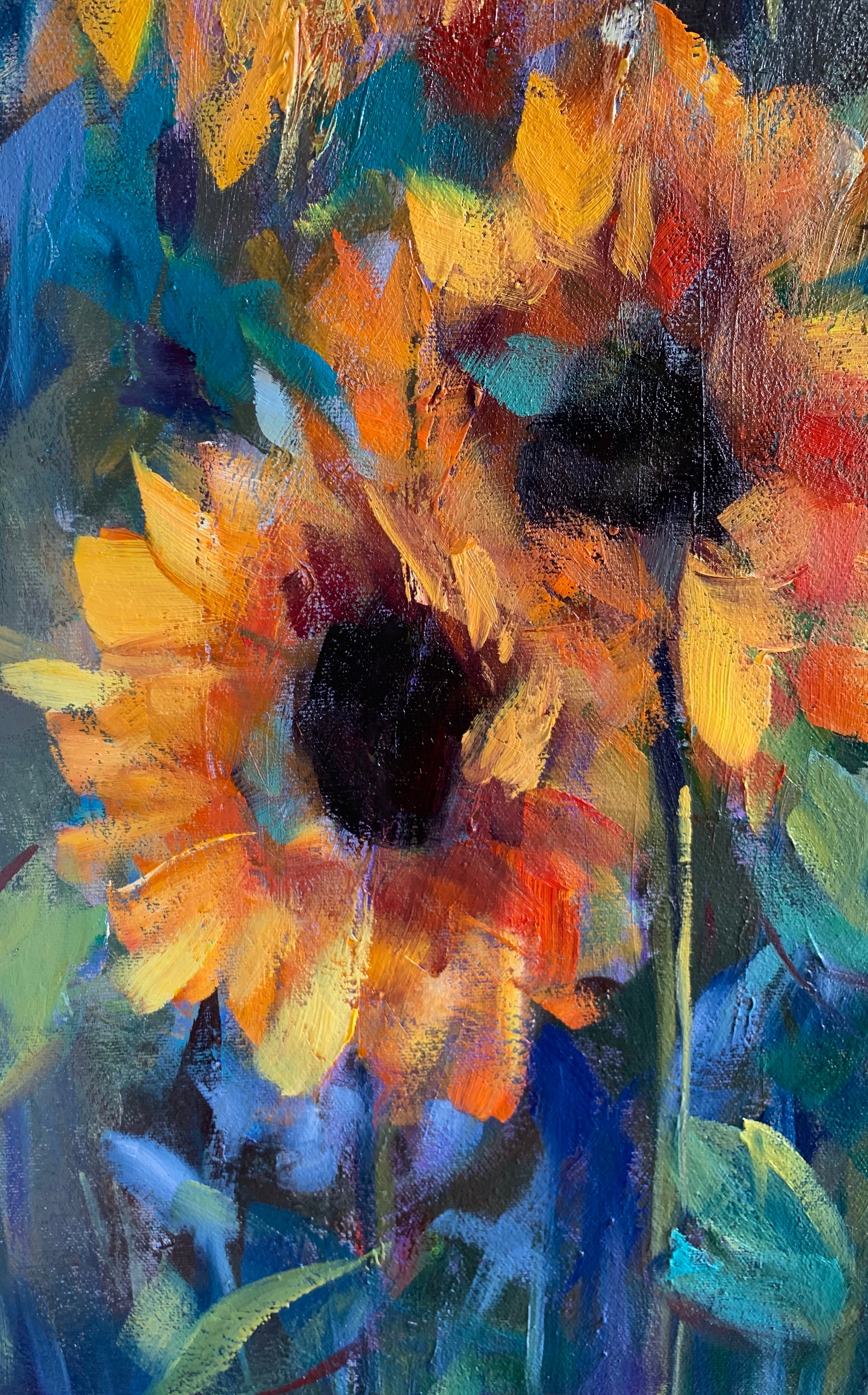 The loose, bold and thick brushstrokes add to the beauty and appeal of this painting. It is interesting both close up and from afar!