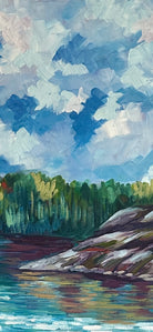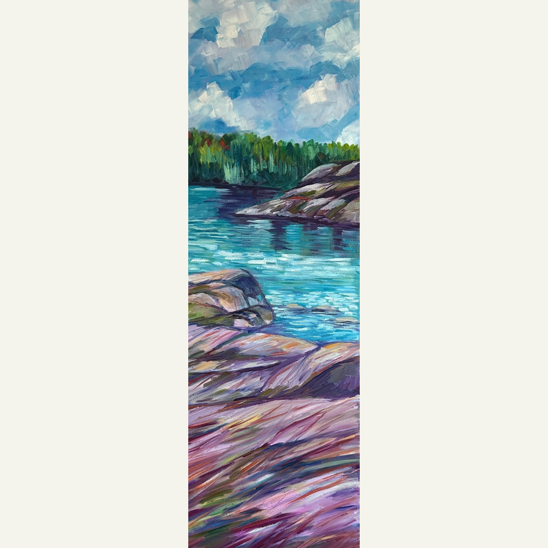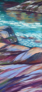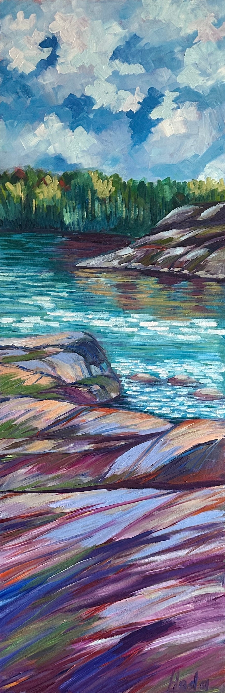 Expressive brushstrokes in rich purples, blues, and earthy tones bring the rocky foreground to life, while the calm water reflects the lush tree line and soft clouds above.