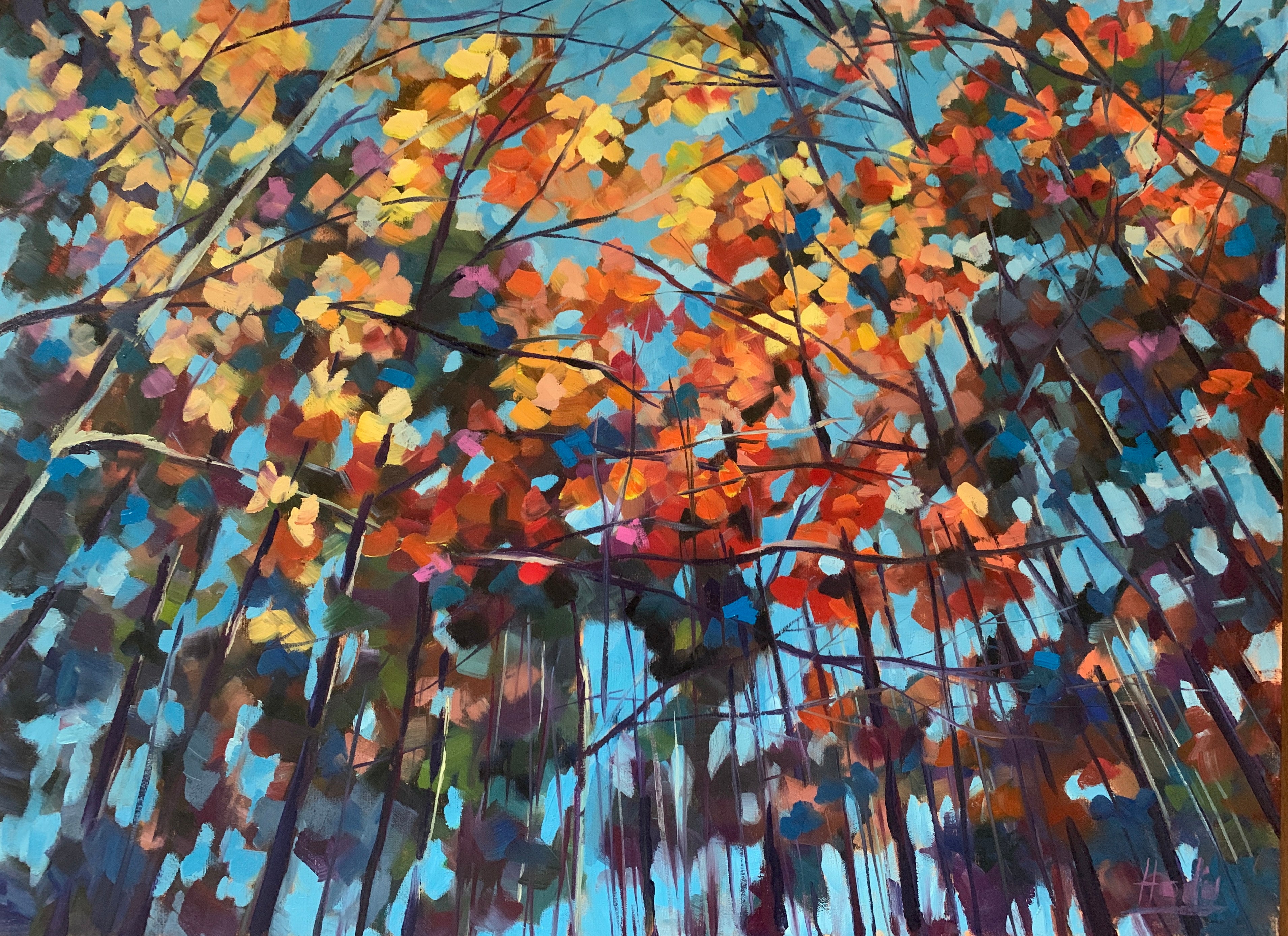 This landscape oil painting captures the beauty of the fall season with an array of colors from orange to yellow to red. Color is used to move the eye around the landscape with areas of high contrast to stop and enjoy the variety of color notes.